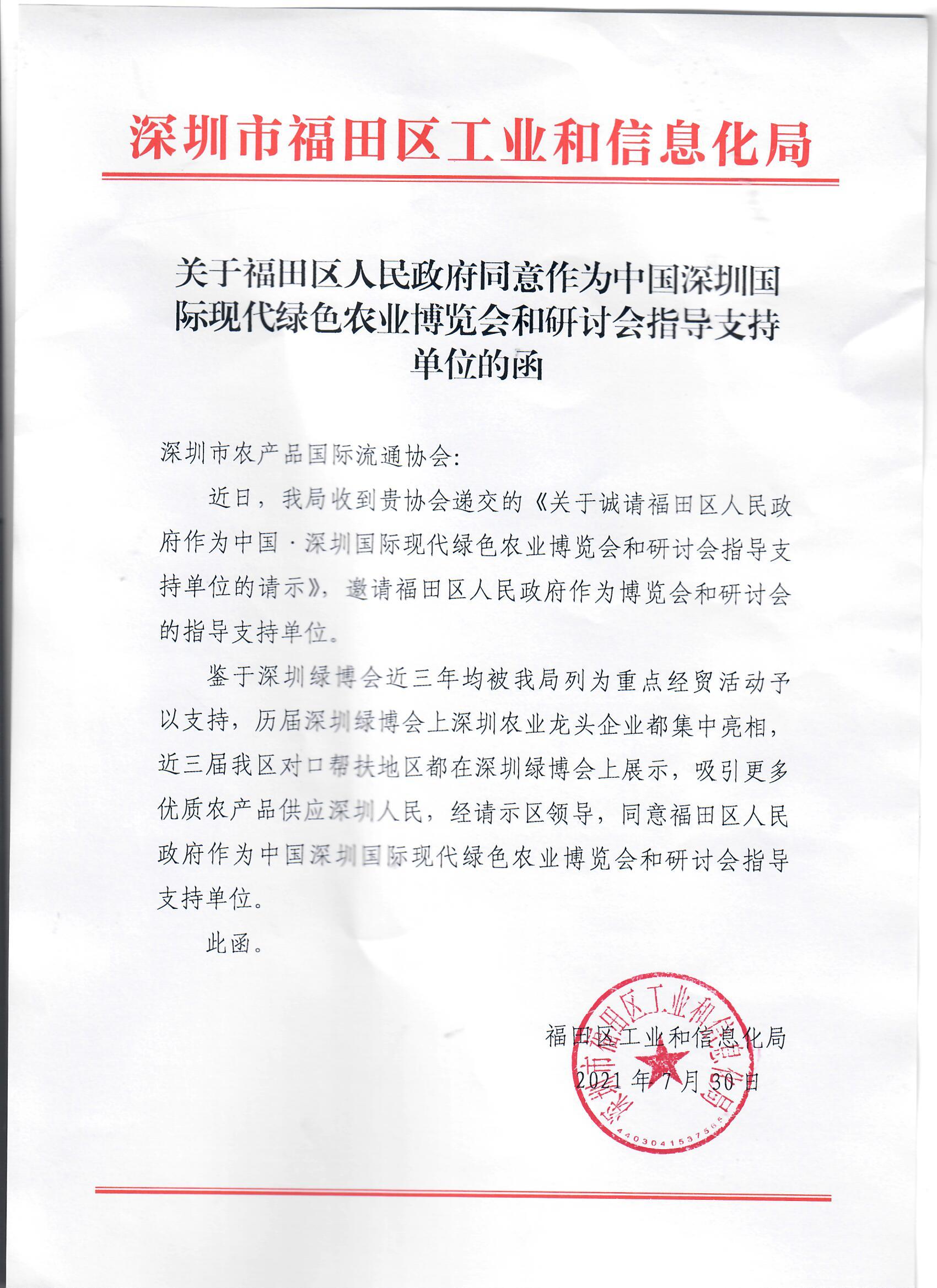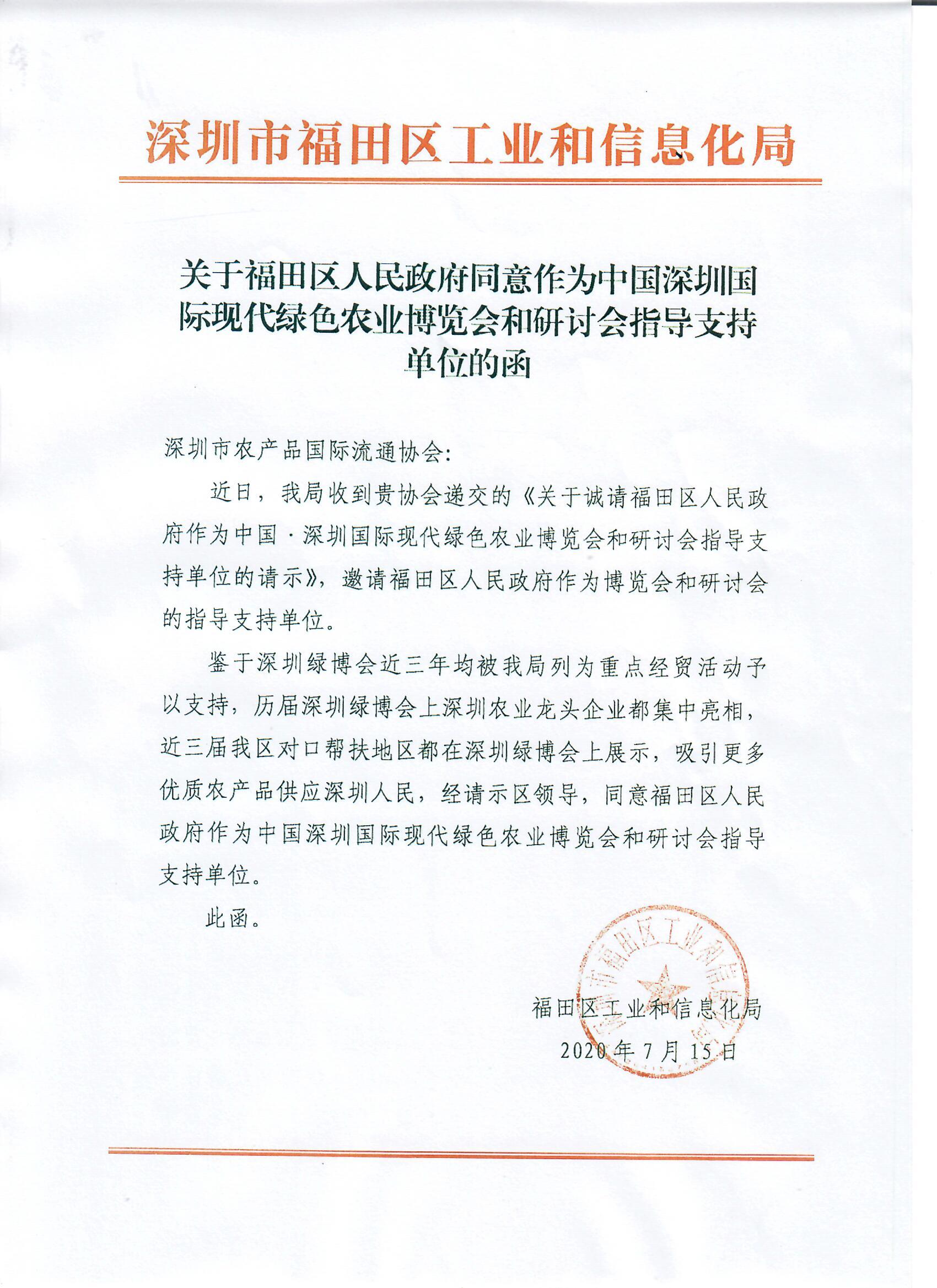 關(guān)于福田區(qū)人民政府同意作為中國深圳國際 現(xiàn)代農(nóng)業(yè)博覽會(huì)和研討會(huì)指導(dǎo)支持單位的函