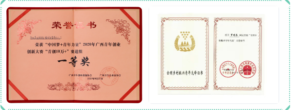 2020年參加廣西青年創(chuàng)業(yè)創(chuàng)新大賽”青創(chuàng)10萬(wàn)+“賽道組”獲一等獎(jiǎng);2018年公司被評(píng)為廣西壯族自治區(qū)“退伍士兵創(chuàng)業(yè)模范單位”;2020年,公司獲廣西壯族自治區(qū)“守合同重信用企業(yè)”、廣西萬(wàn)企幫萬(wàn)村“精準(zhǔn)扶貧行動(dòng)先進(jìn)民營(yíng)企業(yè)”;2021年公司榮獲“廣西鞏固拓展脫貧成果龍頭企業(yè)”。2006年被評(píng)為廣西優(yōu)秀學(xué)生干部。在部隊(duì)5年,當(dāng)班長(zhǎng)2年,獲評(píng)“優(yōu)秀士兵”兩次,連嘉獎(jiǎng)、營(yíng)嘉獎(jiǎng)、“紅旗車駕駛員”各一次,榮獲集體三等功一次。